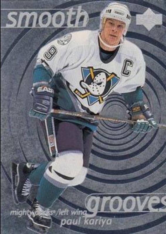 The Paul Kariya 1997 Upper Deck #SG9 Smooth Grooves card is 1 of 10 Paul Kariya's card variations in the 1997 Upper Deck set being tracked by Sports Card Investor, including Base, Game Dated, Box Toppers, Series Two Jumbo, and The Specialists.