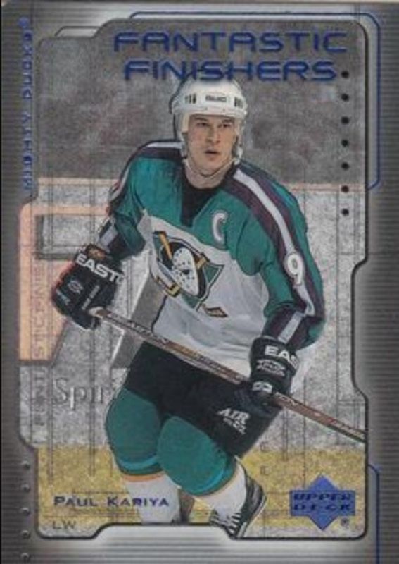 The Paul Kariya 1999 Upper Deck #FF13 Fantastic Finishers card is 1 of 37 Paul Kariya's card variations in the 1999 Upper Deck set being tracked by Sports Card Investor, including #11 Base, #139 Base, #11 UD Exclusives /100, #139 UD Exclusives /100, and #11 UD Exclusives 1/1 /1.