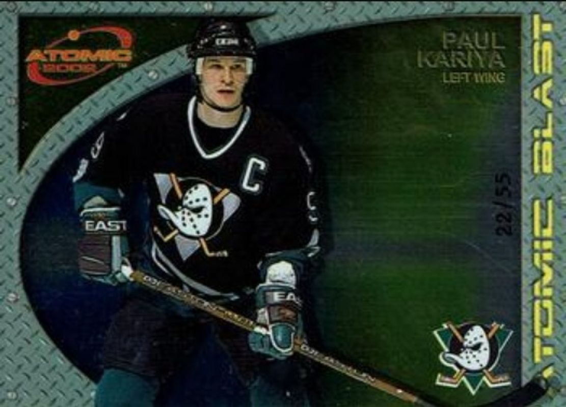 The Paul Kariya 2001 Pacific Atomic #1 Atomic Blast /55 card is 1 of 8 Paul Kariya's card variations in the 2001 Pacific Atomic set being tracked by Sports Card Investor, including Base /500, Red /290, Gold /200, Premiere Date /90, and Blue /9.