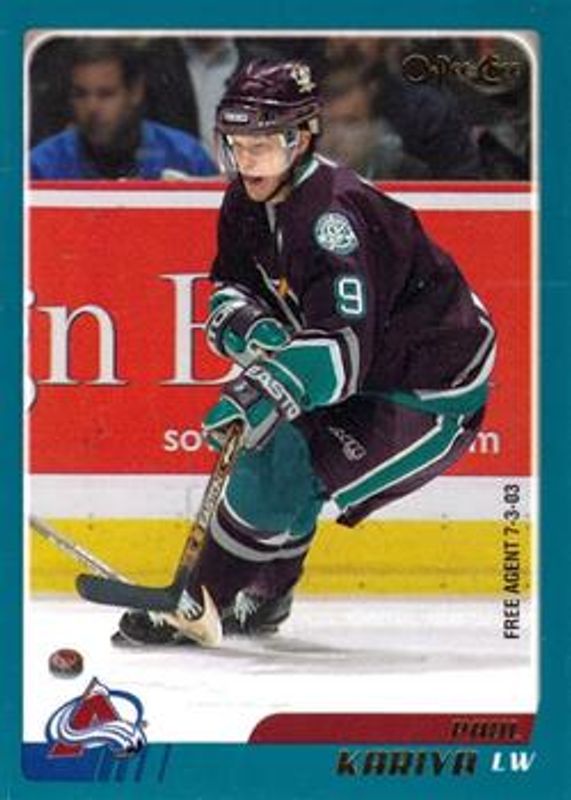 The Paul Kariya 2003 O-Pee-Chee #10 Base card is 1 of 14 Paul Kariya's card variations in the 2003 O-Pee-Chee set being tracked by Sports Card Investor, including #292 Base, #296 Base, #292 Blue /500, #10 Blue /500, and #296 Blue /500.