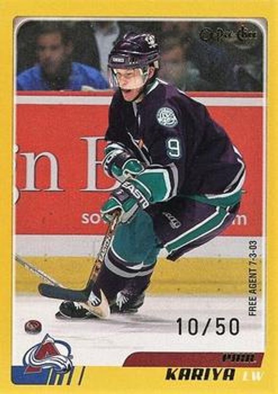 The Paul Kariya 2003 O-Pee-Chee #10 Gold /50 card is 1 of 14 Paul Kariya's card variations in the 2003 O-Pee-Chee set being tracked by Sports Card Investor, including #10 Base, #292 Base, #296 Base, #292 Blue /500, and #10 Blue /500.