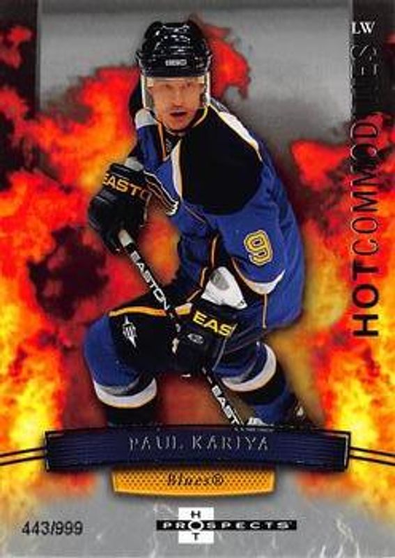 The Paul Kariya 2007 Fleer Hot Prospects #143 Base /399 card is 1 of 6 Paul Kariya's card variations in the 2007 Fleer Hot Prospects set being tracked by Sports Card Investor, including #75 Base /399, #143 Red Hot /25, #75 Red Hot /25, #143 White Hot /1, and #75 White Hot /1.