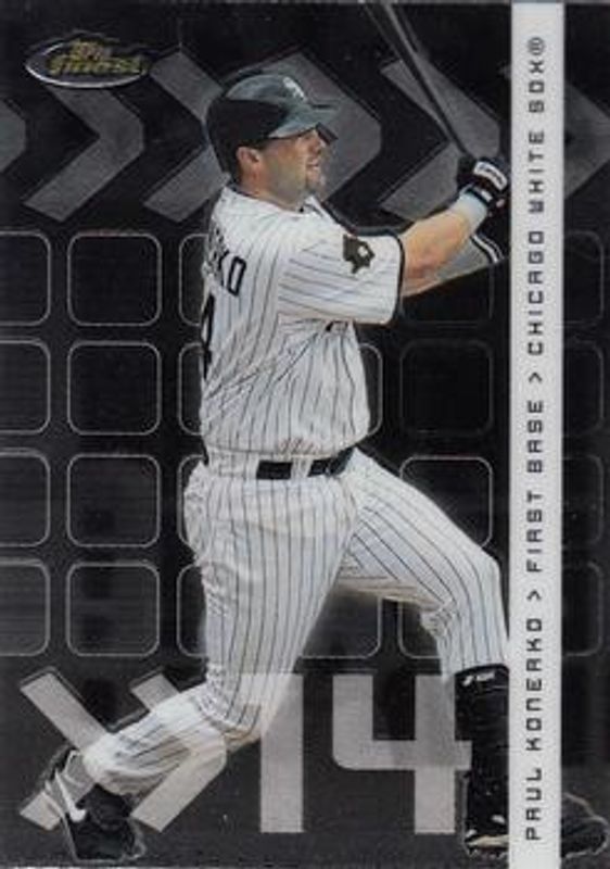 The Paul Konerko 2002 Topps Finest #72 Base card is 1 of 3 Paul Konerko's card variations in the 2002 Topps Finest set being tracked by Sports Card Investor, including Refractor /499, and X-Fractor /299.