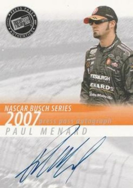 The Paul Menard 2007 Press Pass Autographs Rookie card is 1 of 16 Paul Menard's card variations in the 2007 Press Pass set being tracked by Sports Card Investor, including Base, Blue, Gold, Platinum /100, and eBay Previews /5.