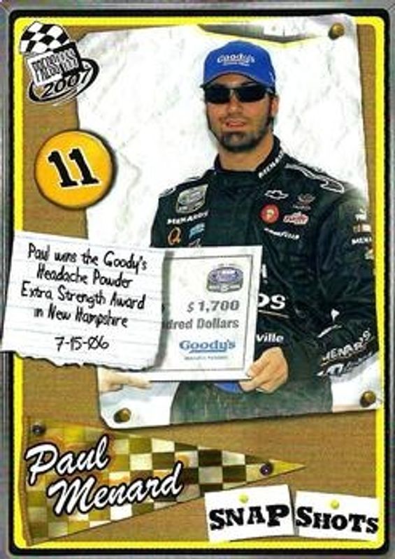 The Paul Menard 2007 Press Pass #SS-29 Snapshots Rookie card is 1 of 16 Paul Menard's card variations in the 2007 Press Pass set being tracked by Sports Card Investor, including Base, Blue, Gold, Platinum /100, and eBay Previews /5.