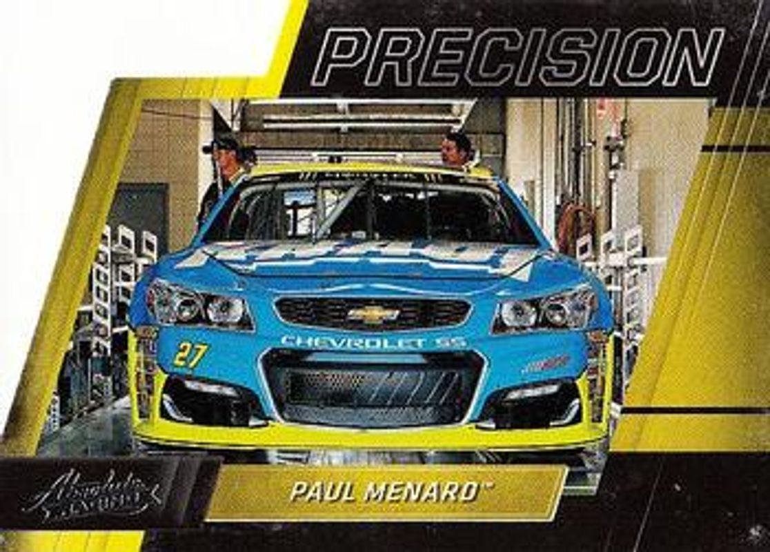 The Paul Menard 2017 Absolute NASCAR #P12 Absolute Precision card is 1 of 30 Paul Menard's card variations in the 2017 Absolute NASCAR set being tracked by Sports Card Investor, including Base, Spectrum Silver /299, Spectrum Blue /199, Spectrum Red /99, and Spectrum Gold /25.