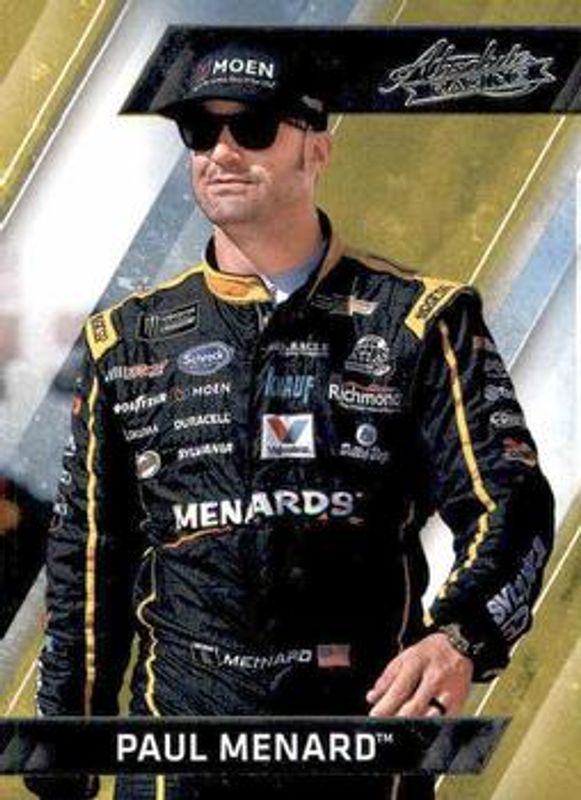 The Paul Menard 2017 Absolute NASCAR #40 Base card is 1 of 30 Paul Menard's card variations in the 2017 Absolute NASCAR set being tracked by Sports Card Investor, including Spectrum Silver /299, Spectrum Blue /199, Spectrum Red /99, Spectrum Gold /25, and Printing Plates Black /1.