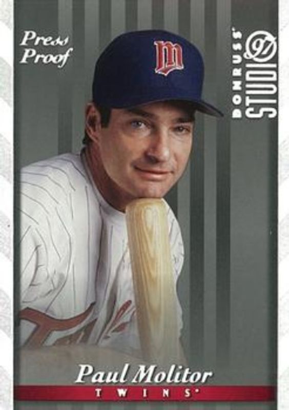 The Paul Molitor 1997 Donruss Studio #11 Press Proof Silver card is 1 of 4 Paul Molitor's card variations in the 1997 Donruss Studio set being tracked by Sports Card Investor, including Base, Press Proof Gold, and Master Strokes /2000.