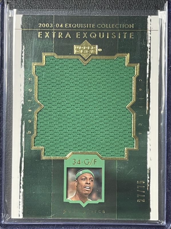 The Paul Pierce 2003 Upper Deck Exquisite Collection #EE-PP Extra Exquisite /75 card is 1 of 12 Paul Pierce's card variations in the 2003 Upper Deck Exquisite Collection set being tracked by Sports Card Investor, including Base /225, Gold /25, Jersey Parallel /25, Patch Parallel /10, and Rainbow /1.