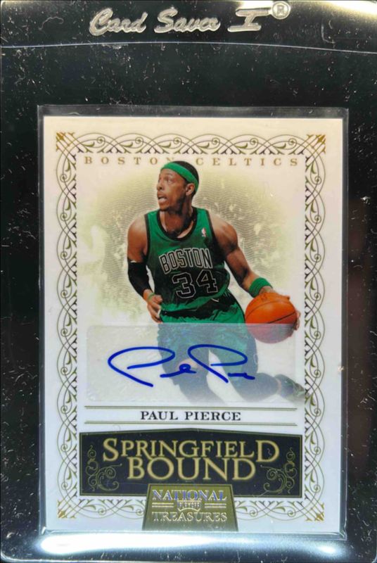 The Paul Pierce 2010 National Treasures #5 Springfield Bound Signatures /25 card is 1 of 29 Paul Pierce's card variations in the 2010 National Treasures set being tracked by Sports Card Investor, including Century Gold /25, Century Silver /10, 2010 Playoff National Treasures /99, Timeline Materials Custom Names /99, and Timeline Materials Custom Team Nicknames /99.