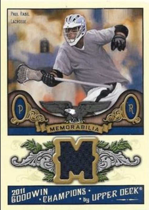 The Paul Rabil 2011 Upper Deck Goodwin Champions #M-PR Memorabilia card is 1 of 13 Paul Rabil's card variations in the 2011 Upper Deck Goodwin Champions set being tracked by Sports Card Investor, including Base, Mini, Mini Foil, Mini Black /49, and Mini Foil Magician Black /9.