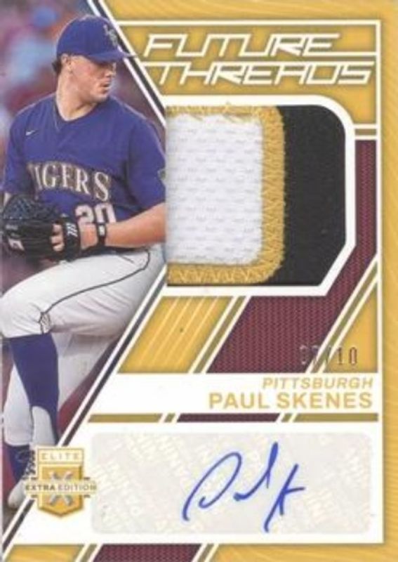 The Paul Skenes 2023 Elite Extra Edition #FTS-PS Future Threads - Gold Signatures /10 card is 1 of 166 Paul Skenes' card variations in the 2023 Elite Extra Edition set being tracked by Sports Card Investor, including #160 Base, #7 Base, #160 Pink, #7 Pink, and #7 Signatures.