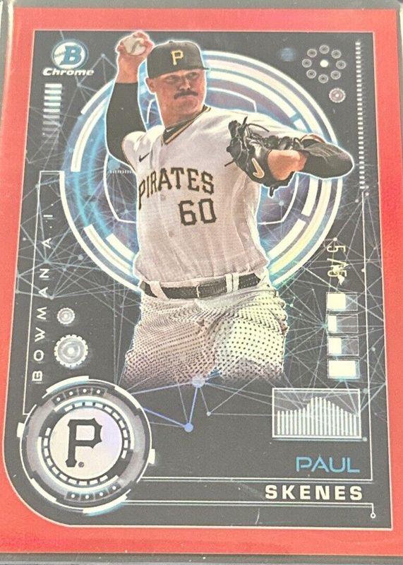 The Paul Skenes 2024 Bowman #BAI-15 Bowman AI - Red Refractor /5 Rookie card in Raw condition has not changed in price in the last 30 days and was last sold for $749.99 .