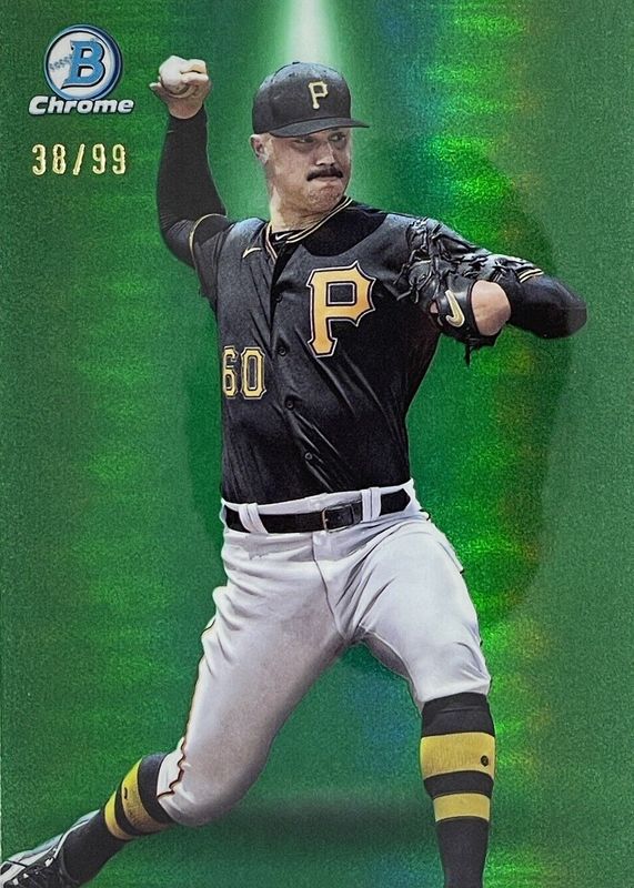 The Paul Skenes 2024 Bowman #BS-1 Bowman Spotlights - Green Refractor /99 Rookie card in Raw condition has not changed in price in the last 30 days and was last sold for $200.00 .