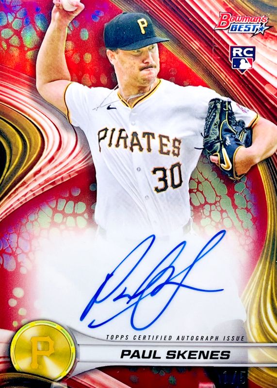The Paul Skenes 2024 Bowman's Best #B24-PS Best of 2024 Autographs - Red Refractor /5 Rookie card in Raw condition has not changed in price in the last 30 days and was last sold for $2,995.00 .