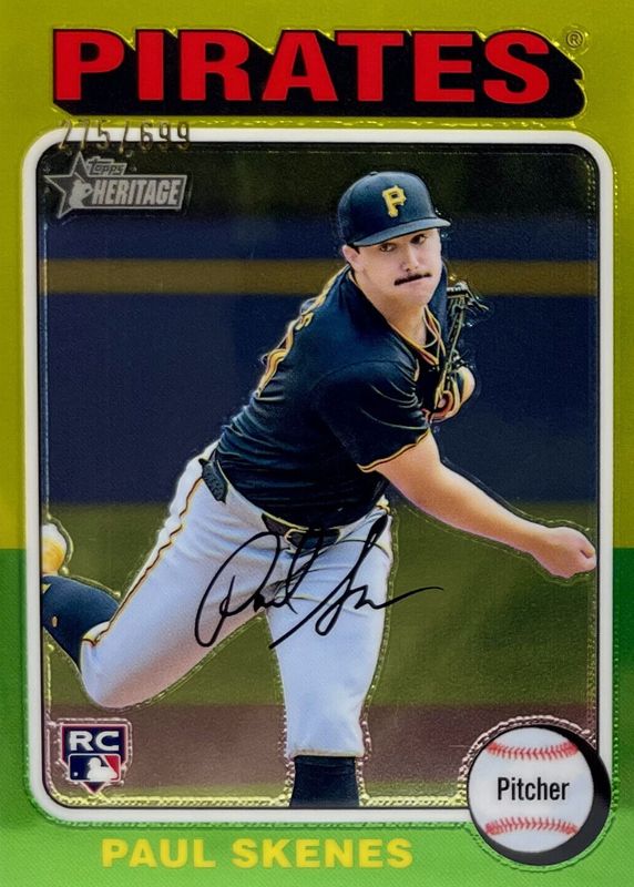 The Paul Skenes 2024 Topps Heritage High Number #594 Chrome /699 Rookie card in Raw condition has moved up $25.00 (+33.3%) in the last 30 days and was last sold for $100.00 .