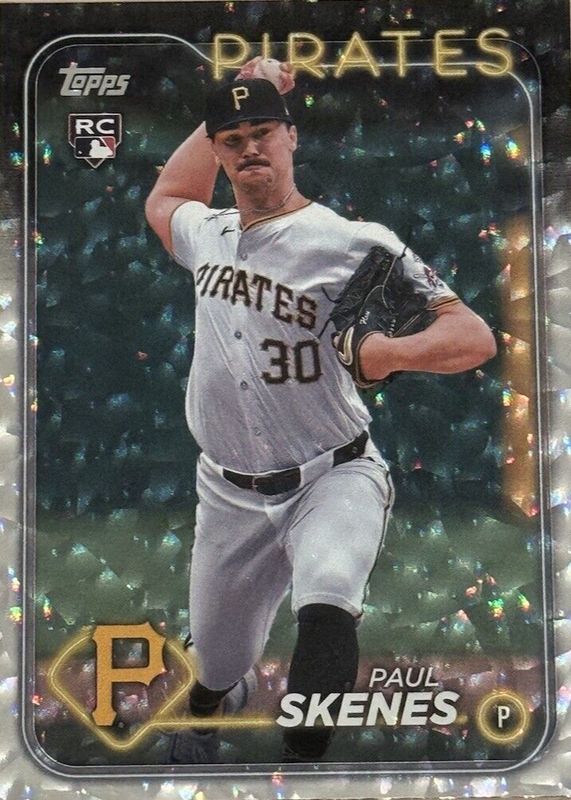 The Paul Skenes 2024 Topps Update #US100 Silver Crackle Foilboard Rookie card in Raw condition has moved down -$14.99 (-50.0%) in the last 30 days and was last sold for $15.00 .