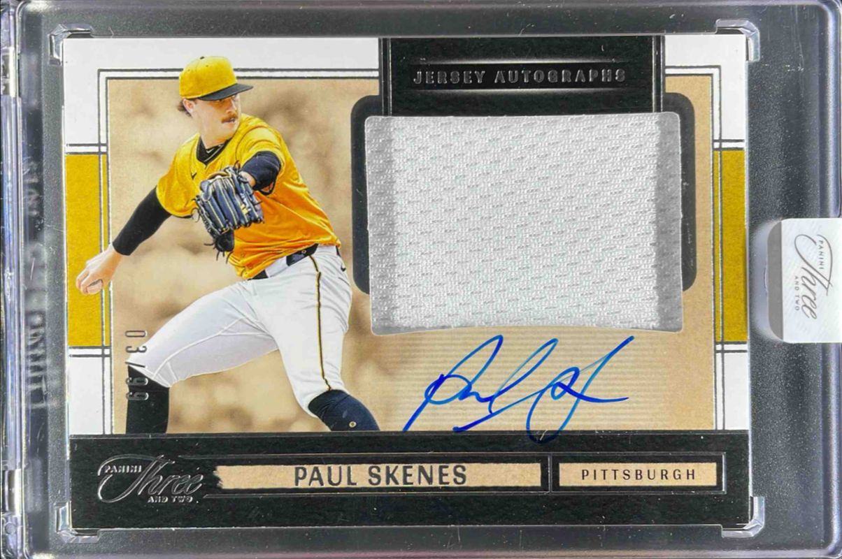 The Paul Skenes 2025 Panini Three and Two #12 Jersey Autographs /99 card is 1 of 49 Paul Skenes' card variations in the 2025 Panini Three and Two set being tracked by Sports Card Investor, including Base /99, Holo Silver /49, Full Count /32, Navy Blue /25, and Holo Blue /15.