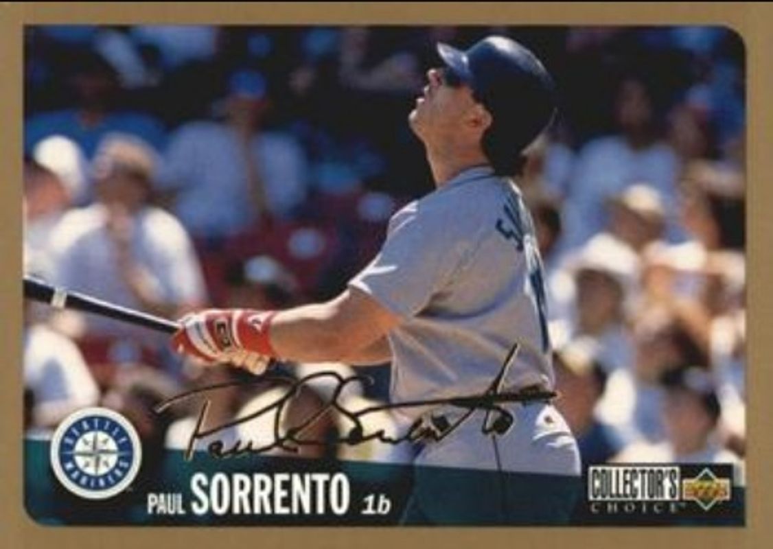 The Paul Sorrento 1996 Upper Deck Collector's Choice #727 Gold Signatures card is 1 of 6 Paul Sorrento's card variations in the 1996 Upper Deck Collector's Choice set being tracked by Sports Card Investor, including #126 Base, #727 Base, #126 Gold Signatures, #126 Silver Signatures, and #727 Silver Signatures.