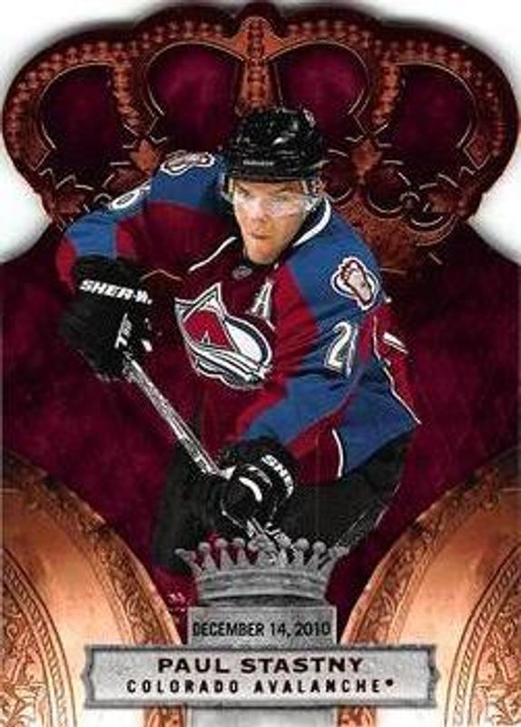 The Paul Stastny 2010 Crown Royale #25 Premiere Date /100 card is 1 of 12 Paul Stastny's card variations in the 2010 Crown Royale set being tracked by Sports Card Investor, including Base /499, Purple /25, Red /1, Heirs to the Throne Materials /250, and Premiere Date Signatures /100.
