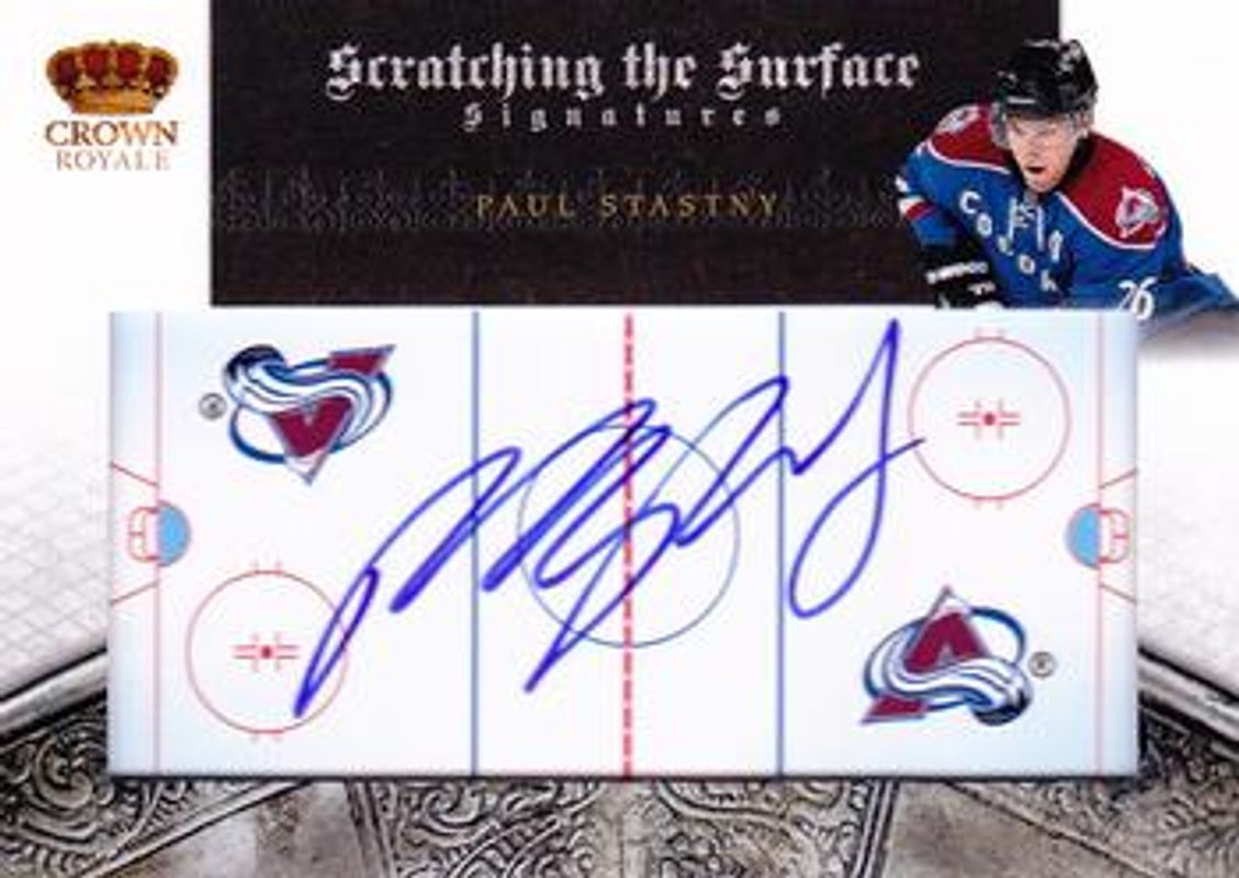 The Paul Stastny 2010 Crown Royale #77 Scratching the Surface Signatures /10 card is 1 of 12 Paul Stastny's card variations in the 2010 Crown Royale set being tracked by Sports Card Investor, including Base /499, Premiere Date /100, Purple /25, Red /1, and Heirs to the Throne Materials /250.