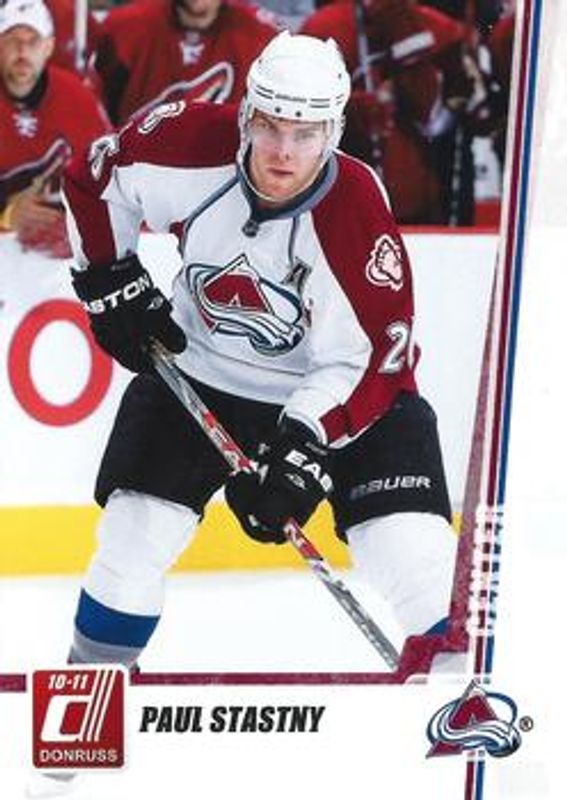 The Paul Stastny 2010 Donruss #92 Base card is 1 of 4 Paul Stastny's card variations in the 2010 Donruss set being tracked by Sports Card Investor, including Press Proofs /100, die-cut Gems /30, and die-cut Gems Autographs /25.