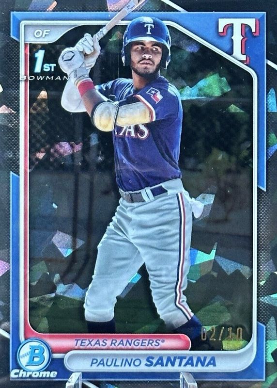 This card is 1 of 28 Paulino Santana's card variations in the 2024 Bowman Chrome Sapphire Edition set being tracked by Sports Card Investor, including Prospects (1st), Prospects Image Variation, Prospects - Yellow /75 (1st), Prospects - Gold /50 (1st), and Prospects Image Variation - Gold /50.