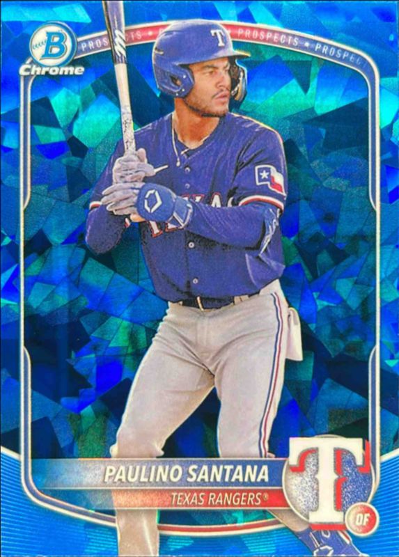 The Paulino Santana 2025 Bowman Sapphire Edition #BCP-72 Chrome Prospects card is 1 of 9 Paulino Santana's card variations in the 2025 Bowman Sapphire Edition set being tracked by Sports Card Investor, including Chrome Prospects - Green Refractor /99, Chrome Prospects - Yellow Refractor /75, Chrome Prospects - Gold Refractor /50, Chrome Prospects - Orange Refractor /25, and Chrome Prospects - Black Refractor /10.