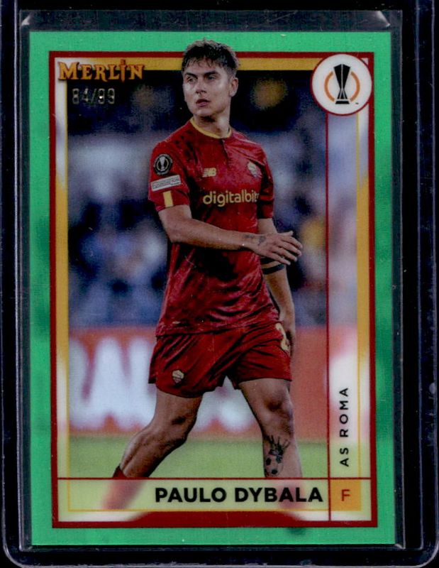 The Paulo Dybala 2022 Topps Merlin Chrome UEFA Club Competitions #23 Green Refractor /99 card is 1 of 22 Paulo Dybala's card variations in the 2022 Topps Merlin Chrome UEFA Club Competitions set being tracked by Sports Card Investor, including Aqua Prism Refractor, Refractor, Vintage Merlin Refractor, Neon Green Shimmer Refractor /350, and Pink Mojo Refractor /275.