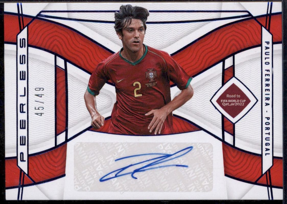The Paulo Ferreira 2022 National Treasures World Cup #PS-PFR Peerless Signatures - Sapphire /49 card is 1 of 27 Paulo Ferreira's card variations in the 2022 National Treasures World Cup set being tracked by Sports Card Investor, including Definitive Ink /99, Legendary Signatures /99, Peerless Signatures /99, Legendary Signatures - Sapphire /49, and Definitive Ink - Sapphire /25.