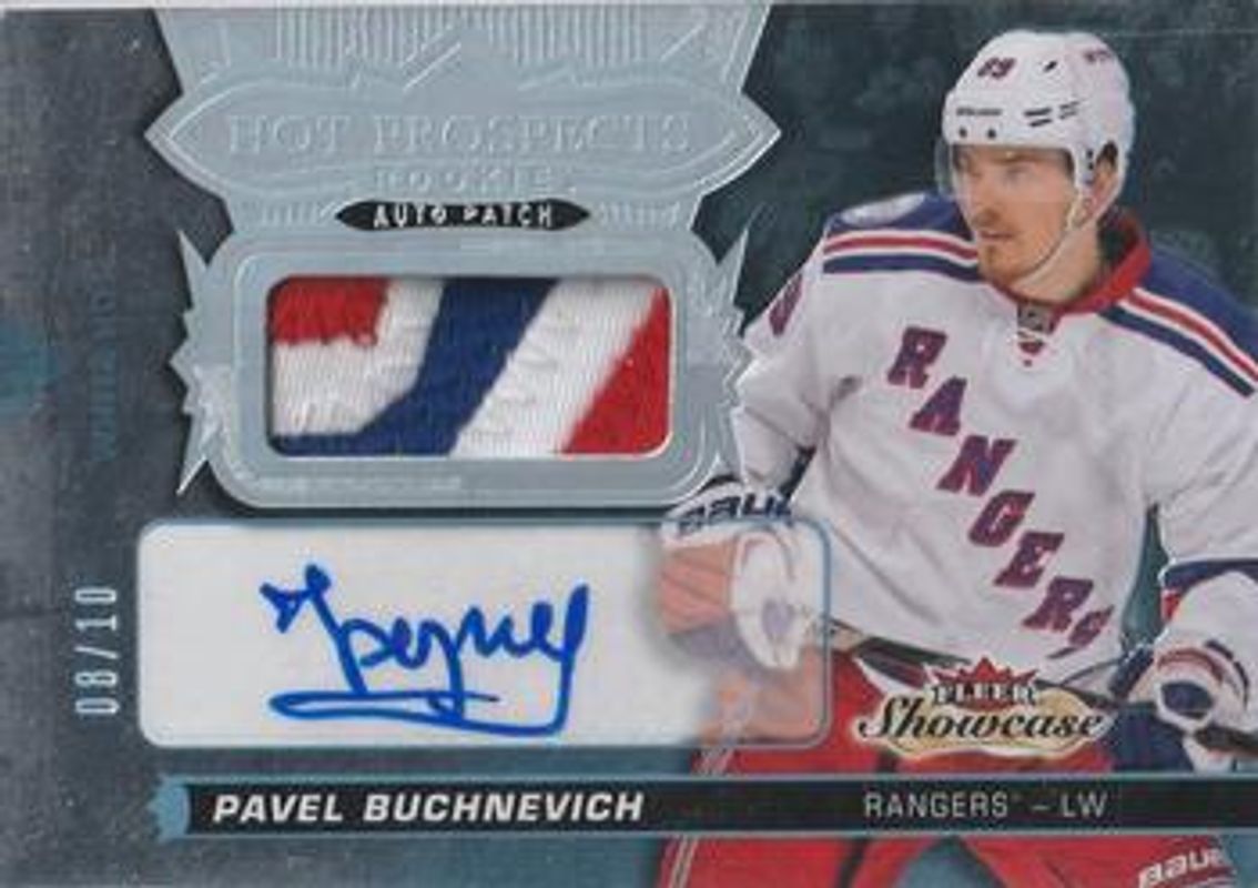 The Pavel Buchnevich 2016 Fleer Showcase #172 Hot Prospects Autographs Patch White Hot /10 Rookie card is 1 of 19 Pavel Buchnevich's card variations in the 2016 Fleer Showcase set being tracked by Sports Card Investor, including Base /399, Hot Prospects Autographs Patch /135, Red Glow /25, White Hot /5, and Flair Showcase.