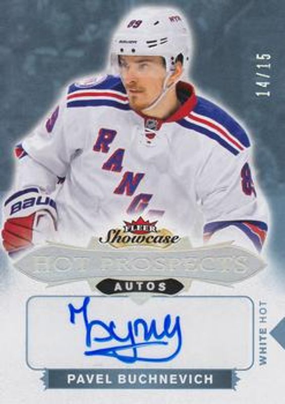 The Pavel Buchnevich 2016 Fleer Showcase #172 White Hot /5 Rookie card is 1 of 19 Pavel Buchnevich's card variations in the 2016 Fleer Showcase set being tracked by Sports Card Investor, including Base /399, Hot Prospects Autographs Patch /135, Red Glow /25, Hot Prospects Autographs Patch White Hot /10, and Flair Showcase.