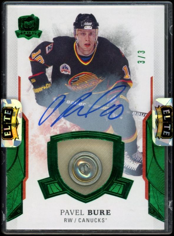 The Pavel Bure 2023 Upper Deck The Cup #80 2017 The Cup Update - Green Foil /3 card is 1 of 9 Pavel Bure's card variations in the 2023 Upper Deck The Cup set being tracked by Sports Card Investor, including 2017 The Cup Update Limited Logos /10, 2017 The Cup Update Rookie Tribute /10, 2017 The Cup Update - Gold Foil /8, 2018 The Cup Update Autographed Ticket Booklets /6, and 2017 The Cup Update Autographed Ticket Booklets /4.