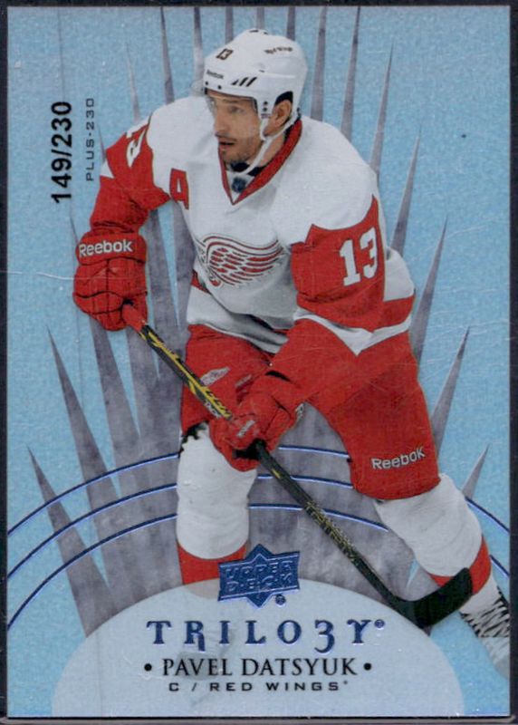 The Pavel Datsyuk 2014 Upper Deck Trilogy #19 Radiant Blue /499 card is 1 of 14 Pavel Datsyuk's card variations in the 2014 Upper Deck Trilogy set being tracked by Sports Card Investor, including Base /799, Radiant Green /199, Radiant Black /3, Printing Plates Black /1, and Printing Plates Cyan /1.
