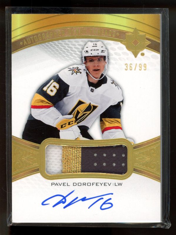 The Pavel Dorofeyev 2021 Upper Deck Ultimate Collection #ADT-PD Debut Threads /99 Rookie card is 1 of 23 Pavel Dorofeyev's card variations in the 2021 Upper Deck Ultimate Collection set being tracked by Sports Card Investor, including Base /299, Ultimate Emblems - Auto, Ultimate Emblems Rookies - Auto, Ultimate Introductions, and Ultimate Introductions - Auto.