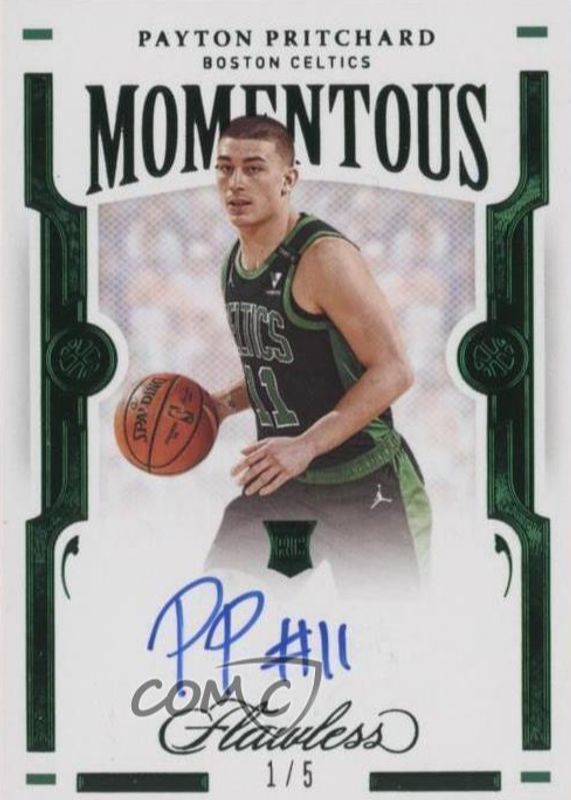 The Payton Pritchard 2020 Flawless #MOM-PAY Momentous Autographs - Emerald /5 Rookie card in Raw condition has not changed in price in the last 30 days and was last sold for $370.79 .