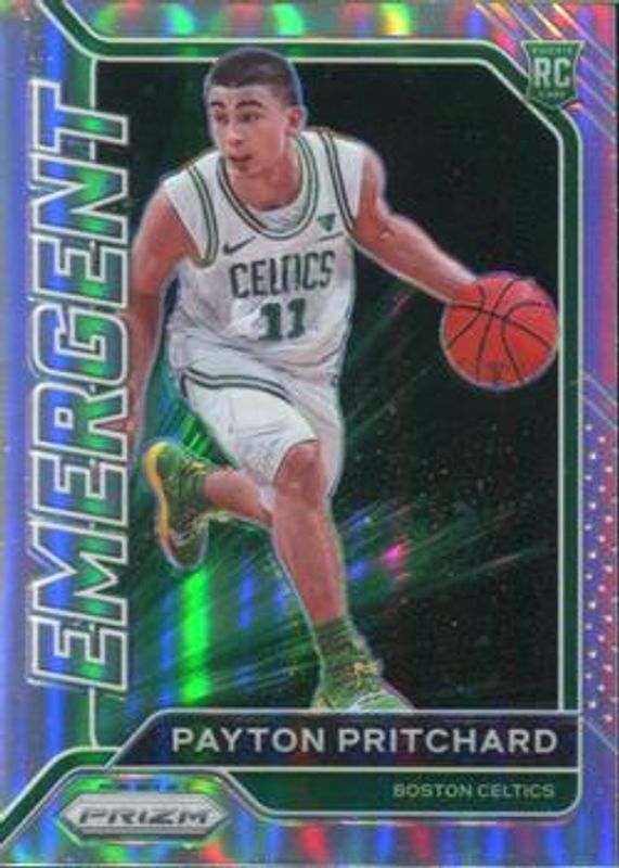The Payton Pritchard 2020 Prizm #18 Emergent - Silver Rookie card is 1 of 73 Payton Pritchard's card variations in the 2020 Prizm set being tracked by Sports Card Investor, including Base, Choice Blue Yellow Green, Fast Break, Green, and Green Ice.