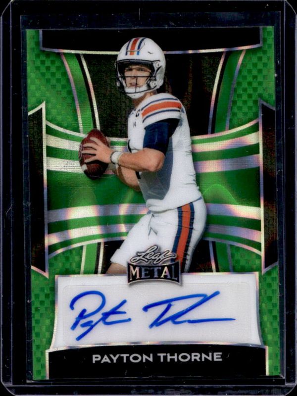 The Payton Thorne 2025 Leaf Metal #BA-PT1 Autographs - Lava Green /5 card is 1 of 169 Payton Thorne's card variations in the 2025 Leaf Metal set being tracked by Sports Card Investor, including Prismatic Silver /149, Prismatic Blue /49, Prismatic Red /25, Prismatic Purple /10, and Prismatic Green /7.