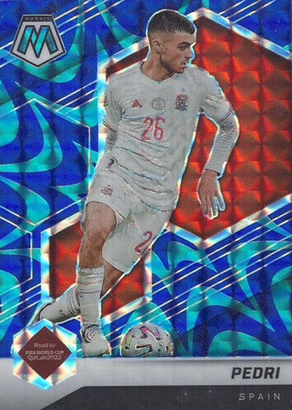 The Pedri 2021 Mosaic Road to FIFA World Cup #130 Reactive Blue card in Raw condition has not changed in price in the last 30 days and was last sold for $8.50 .