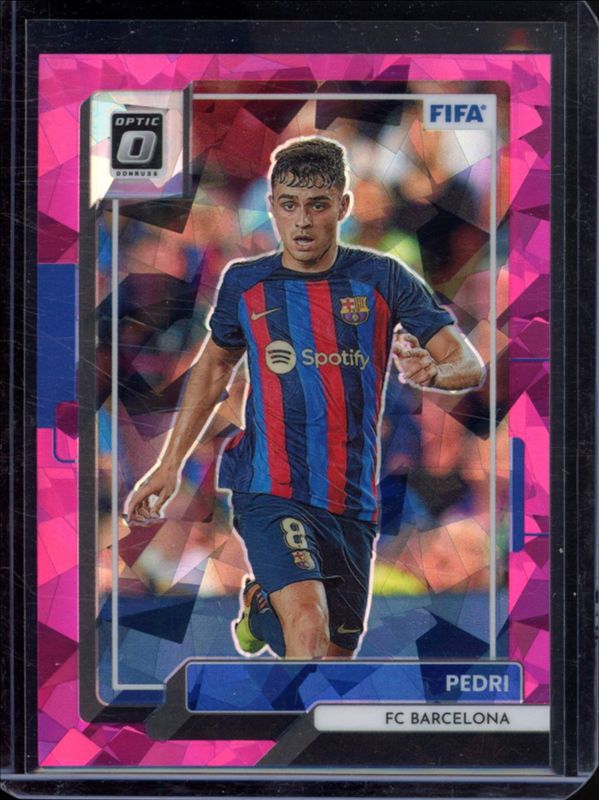 The Pedri 2022 Donruss #33 Optic - Pink Ice /25 card is 1 of 40 Pedri's card variations in the 2022 Donruss set being tracked by Sports Card Investor, including Base, Green, Optic, Optic - Green Ice, and Optic - Holo.