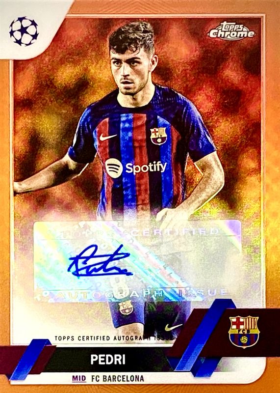 The Pedri 2022 Topps Chrome UEFA Club Competitions #CA-P Autographs - Orange Refractor /25 card in Raw condition has not changed in price in the last 30 days and was last sold for $69.80 .