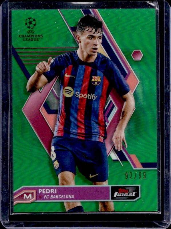 The Pedri 2022 Topps Finest UEFA Club Competitions #8 Green Refractor /99 card is 1 of 28 Pedri's card variations in the 2022 Topps Finest UEFA Club Competitions set being tracked by Sports Card Investor, including Base, Refractor, Purple Refractor /299, Sky Blue Refractor /275, and Blue Aqua Vapor Wave Refractor /250.