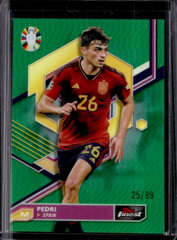 The Pedri 2023 Topps Finest Road to UEFA Euro #79 Green Refractor /99 card is 1 of 32 Pedri's card variations in the 2023 Topps Finest Road to UEFA Euro set being tracked by Sports Card Investor, including Base, Refractor, Blue Aqua Vaporwave Refractor /250, Blue Refractor /150, and Green Speckle Refractor /125.