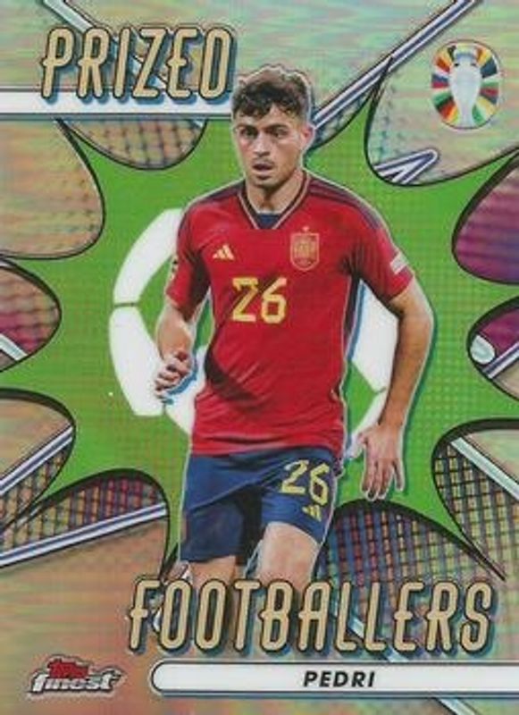 The Pedri 2023 Topps Finest Road to UEFA Euro #PF-PE Prized Footballers card is 1 of 32 Pedri's card variations in the 2023 Topps Finest Road to UEFA Euro set being tracked by Sports Card Investor, including Base, Refractor, Blue Aqua Vaporwave Refractor /250, Blue Refractor /150, and Green Speckle Refractor /125.