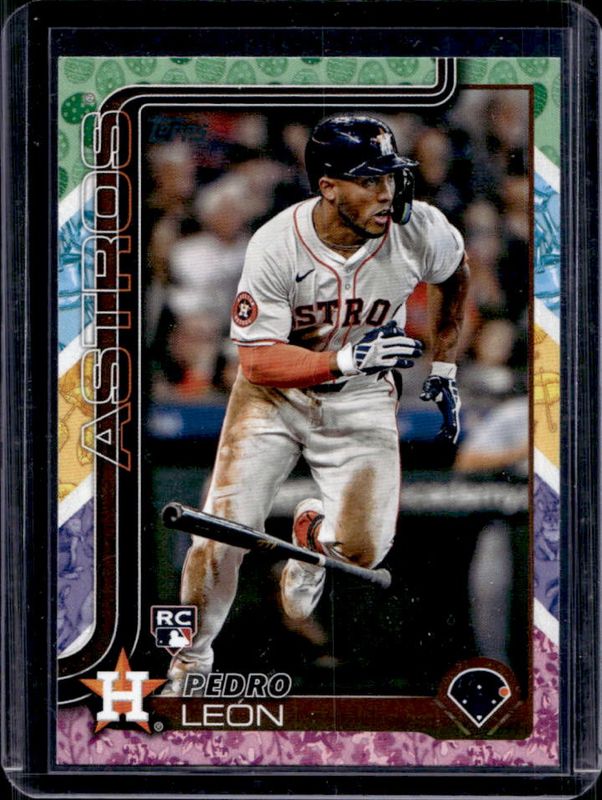 The Pedro Leon 2025 Topps #30 Easter Holiday Tin Border Rookie card is 1 of 70 Pedro Leon's card variations in the 2025 Topps set being tracked by Sports Card Investor, including Base, Aqua Holo Foil, Diamante Foil, Holo Foil, and Pink Diamante Foil.