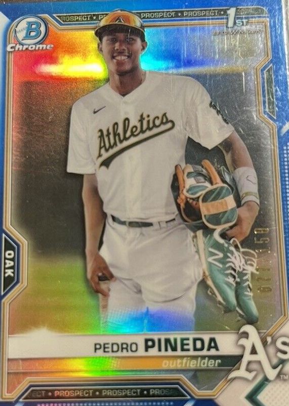 This card is 1 of 24 Pedro Pineda's card variations in the 2021 Bowman Chrome set being tracked by Sports Card Investor, including Prospects (1st), Prospects - Black & White Mini-Diamond Refractor (1st), Prospects - Shimmer Refractor (1st), Prospects - Refractor /499 (1st), and Prospects - Speckle Refractor /299 (1st).