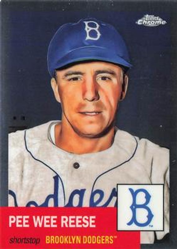 The Pee Wee Reese 2022 Topps Chrome Platinum Anniversary #341 Base card is 1 of 34 Pee Wee Reese's card variations in the 2022 Topps Chrome Platinum Anniversary set being tracked by Sports Card Investor, including Black & White Mini Diamond Refractor, Blue Prism Refractor, Gold Prism Refractor, Prism Refractor, and Red Prism Refractor.