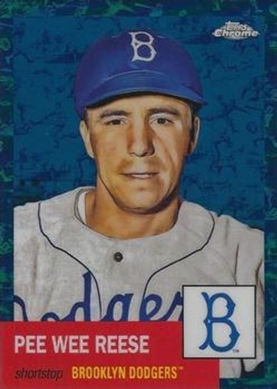 The Pee Wee Reese 2022 Topps Chrome Platinum Anniversary #341 Platinum Toile White Blue Refractor /199 card is 1 of 34 Pee Wee Reese's card variations in the 2022 Topps Chrome Platinum Anniversary set being tracked by Sports Card Investor, including Base, Black & White Mini Diamond Refractor, Blue Prism Refractor, Gold Prism Refractor, and Prism Refractor.