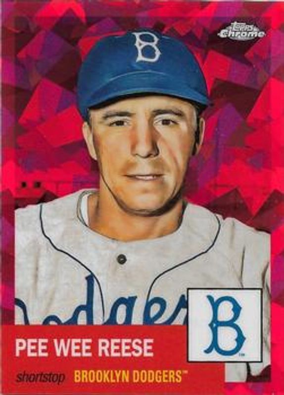 The Pee Wee Reese 2022 Topps Chrome Platinum Anniversary #341 Red Atomic Refractor /100 card is 1 of 34 Pee Wee Reese's card variations in the 2022 Topps Chrome Platinum Anniversary set being tracked by Sports Card Investor, including Base, Black & White Mini Diamond Refractor, Blue Prism Refractor, Gold Prism Refractor, and Prism Refractor.
