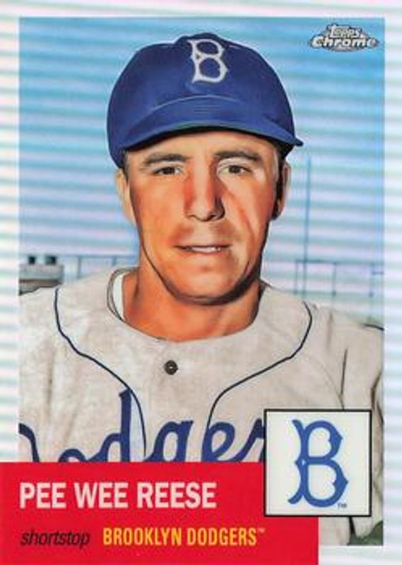 The Pee Wee Reese 2022 Topps Chrome Platinum Anniversary #341 Refractor card is 1 of 34 Pee Wee Reese's card variations in the 2022 Topps Chrome Platinum Anniversary set being tracked by Sports Card Investor, including Base, Black & White Mini Diamond Refractor, Blue Prism Refractor, Gold Prism Refractor, and Prism Refractor.